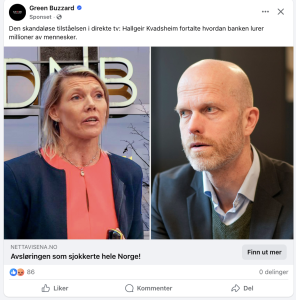Nå er det min tur. Den falske artikkelen på Facebook omhandler en samtale jeg skal ha hatt med DNBs konserndirektør Kjerstin Braathen hos, ja nettopp, TV2 God Morgen, hvor det utviklet seg til en krangel mellom oss om handelsplattformen Evo Bridge. Bare bullshit, selvsagt. Jeg har aldri møtt Braathen, langt mindre sittet i God Morgen-studio, og selv om jeg kan være uenig med DNB-sjefen, er vi nok helt på linje med at dette er reinspikka svindel.